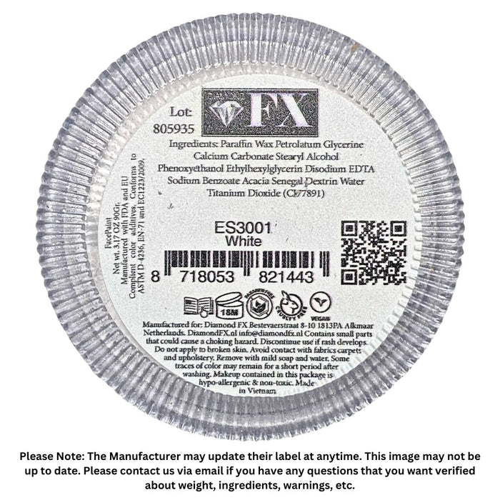 is designed to paint faces. You can use this white face paint on your next Halloween Costume, or to paint faces as a professional face painter or amateur painter at your next birthday party, fundraising, carnival, corporate event, or simply at home to have fun on your own or with your kids face painting fun designs. Diamond FX's Essential White is perfect for creating even bases and obtaining clean strokes when using a fine brush for your line work. Its very pigmented, making it look vivid even when dry. This color works great for sugar skulls, full face clowns, animal muzzles and whiskers, clouds, and more! Purchase the 90gr size when you know you'll be using a lot!