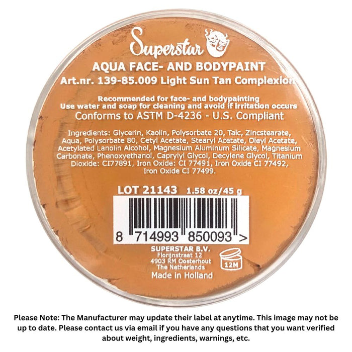 Superstar es una pintura facial altamente pigmentada, lisa y cremosa. Se mezcla fácilmente, se seca en 30 segundos sobre la piel hasta obtener una cobertura pareja. Superstar Light Sun Tan Complexion es un tono muy bueno para imitar un color bronceado claro en personas de tez clara. También es un bueno para zombies. Es un tono claro para mezclar con tonos color carne más oscuro para diseños de animales peludos, o para crear ilusiones de maquillaje. Si quieres ser profesional, puedes obtener Superstar Light Sun Tan Complexion en el envase de 45 gramos.