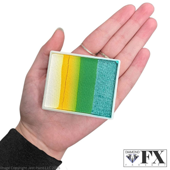 TIPS for using 50gr Rainbow Cakes: The large 50 gram cakes can be used in their entirety if you load all of the colors up on half of a circle sponge. You can load the flat side of the sponge, or the rounded side. If you load on the rounded side you have more control over how much of the rainbow you want to press against the skin as you work around the face. You simply rock the sponge and pat as you move around the face. If you use the flat side of the sponge you will get the whole rainbow on the face, unless you pull up one of the edges of the sponge…which can lead to messy hands.