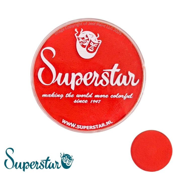 Superstar is a highly pigmented smooth and creamy face paint. They blend easily, dry within 30 seconds on the skin and dry to a smudge free coverage. Superstar Bright Orange lives up to it's name. Bright Orange is very pigmented with slight red undertones and works great as the darker tone to blend in to yellow or a lighter orange for tigers or full face pumpkins. See the attached face painting swatches! It is the darkest true orange that we carry. If you find yourself painting a lot of tigers or pumpkins, this 45 gram container will be perfect for your kit.