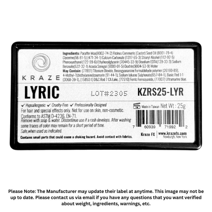 El Lyric cake es un hermoso combo para mariposas, flores y escenas de playa. Los domed rainbow cakes Kraze FX vienen en dos tamaños. Este rainbow cake 1 stroke es perfecto para cargar con un pincel plano o angular de 1 "o 3/4". La forma abovedada te ayuda a obtener una mejor carga porque el área de superficie es más elevada en el centro, y el agua corre hacia los bordes para que puedas drenarla si es necesario y evitar un centro demasiado cremoso. La base de cera para la pintura Kraze FX lo hace fácil de usar y se mantiene cómodo y flexible, y también libre de manchas. Esta pastilla contiene algunos colores neón. Los colores neón de Kraze FX contienen pigmentos no tóxicos que la FDA no ha probado para su uso en cosméticos, pero se han probado de forma independiente para demostrar que son hipoalergénicos y seguros para el uso cosmético. Debido al hecho de que la FDA no los reconoce como que contienen solo pigmentos de grado cosmético, están etiquetados como un producto especial FX para usar solo en cabello y efectos especiales.