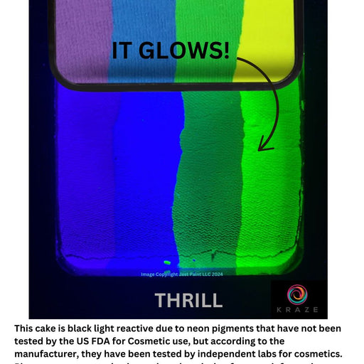 NOTICE: at our store we sell not only face and body paints and tools but also Special FX (SFX) products designed to be used for special effects only. UV/Neon colors that have that notice on their description and/or name indicate that they are not considered a cosmetic product within the USA and Europe. These KRAZE UV/Neon products have yet to be tested by the USA FDA for cosmetic safety so manufacturers have labeled them and sell them as a Special FX product to be used on clothing, over prosthetics, etc. to create a black light glow effect. This warning does not apply to all countries that we sell to, please look into your own country's regulations for neon paints. Any Neon/UV paint without that warning has been determined to be cosmetic compliant by the manufacturer. At Jest Paint we don't label these products and are not responsible for manufacturer's claims or label's compliance, but we do our best to make sure that the label information provided to us is available on our website as well. If you have questions please contact the manufacturer directly.