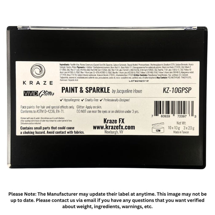 Kraze FX matte and metallic paints are EU and FDA compliant for cosmetic use. Read Neon Info Below. Kraze is Vegan and it is gluten, perfume, and paraben free. Kraze does not contain nut based ingredients either, which makes it a great choice for those with nut allergies. Kraze Paint is wax based and it is easy to use. When applied as instructed, Kraze has a crack resistant long lasting finish. The consistency, weight and volume may vary depending on water evaporation after production. Sometimes paint dry and cracks form on the surface or between color strips.
