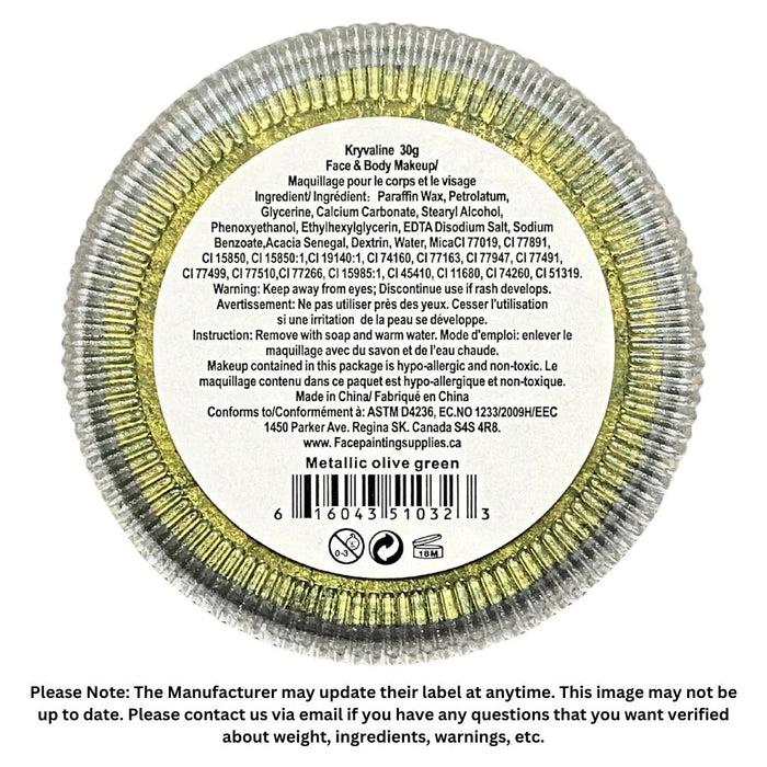 All Kryvaline Metallic colors are really nice for blending and line work. Kryvaline Metallic Olive Green is such a cool color! You will love it for sea monster masks, Mardi Gras makeovers, mermaids and forest fairies. It looks great blended in with Gold, Old Gold, Metallic White or Copper.