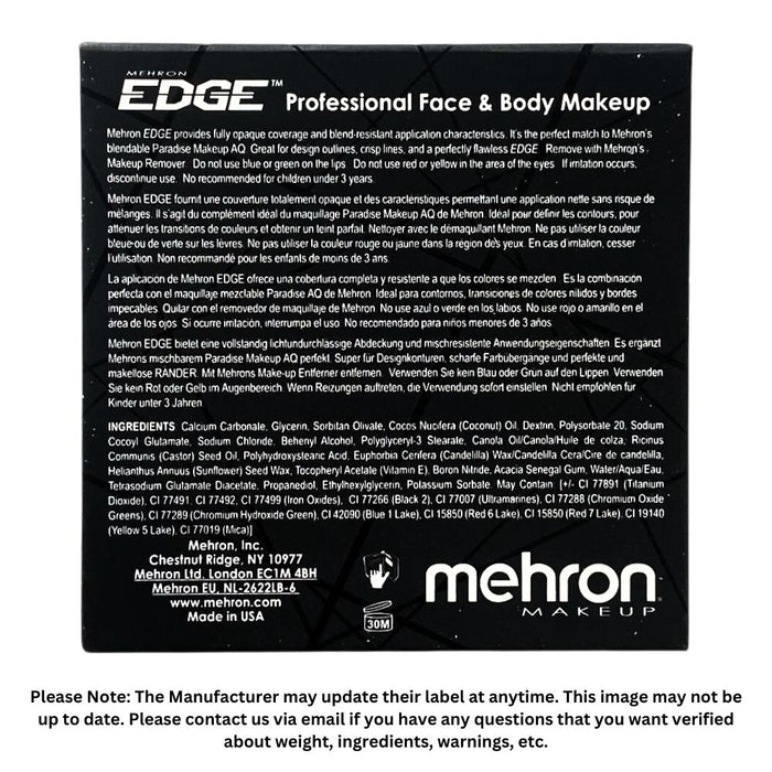 EDGE Professional Face and Body Makeup was designed by Mehron to work as an amazing bleed resistant line work and layering face and body paint. Unlike Paradise face paint, which is very easy to blend with other colors on the skin, EDGE has a blend resistant / water resistant feature, so that you can layer colors with out activating the colors below. They are perfect to use as line work paints when using Paradise face paint as a base. Edge will give you the crispest, boldest line work and super solid coverage, with a flawless edge. EDGE 's rich bright Yellow is incredible for tear drops, line work and dots on top of darker colors. Paint sun flowers, butterflies, felines, eye masks and so much more! Mix with Edge Red to make a beautiful orange. You will experience a much brighter Yellow that won't pick up the underlying colors as much as normal face paint. EDGE's water resistant characteristics also make it perfect for events where your model will need a long lasting, durable, smudge free face paint.Think dance clubs, sporting events, or summer time parties. If you are looking for a Vegan face paint, The EDGE line is Vegan / Cruelty / Talc / Paraben / Gluten / PEG / Petroleum Free. Mehron included the beneficial properties of Coconut Oil, Olive Oil, and Vitamin E to the EDGE face paint so that it feels great on the skin!