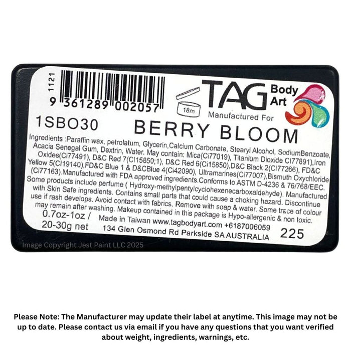 Todos los colores regulares están hechos con ingredientes que cumplen con las normas FDA y son hipoalergénicos. Los productos TAG se hacen en Taiwán bajo la dirección de TAG Body Art en Australia. No contienen parabenos ni lanolina para reducir el riesgo de reacciones alérgicas. Las pinturas TAG son veganas y no se han probado en animales.