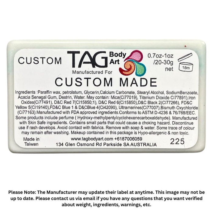 All regular colors are made with FDA compliant ingredients and are hypoallergenic. TAG cakes are made in Taiwan under the direction of TAG Body Art in Australia. They contain no parabens or lanolin to reduce the risk of allergic reactions. TAG cakes are vegan and they are not tested on animals.