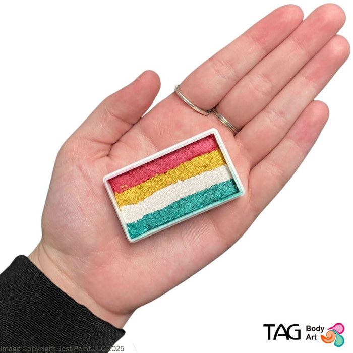 Todos los TAG 1 Strokes son perfectos para el diseños en mejillas, máscaras y diseños de rostro completo. Tener Christmas Sparkle en tu kit te inspirará a crear miles de hermosos diseños navideños. ¡Mantuvimos el verde alejado del rojo para que la pastilla sea agradable y brillante!