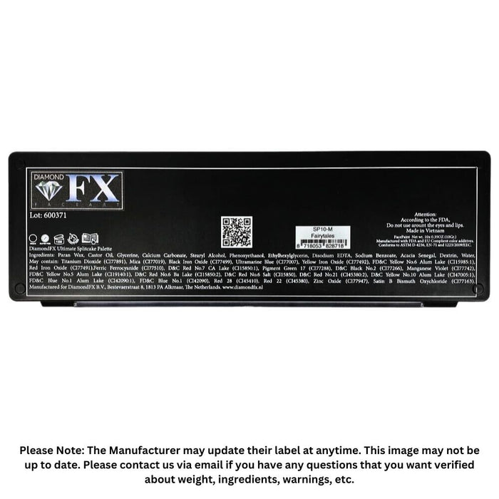 Diamond FX FLORA AND FAUNA Ultimate Splitcake Palette Ingredients: Paraffin Wax, Castor Oil, Glycerin, Calcium Carbonate, Stearyl Alcohol, Phenoxyethanol, Ethylhexylglycerin, Disodium EDTA, Sodium Benzoate, Acacia Senegal, Dextrin, Water, May contain: Titanium Dioxide (C177891), Mica (C177019), Black Iron Oxide (C177499), Ultramarine Blue (C177007), Yellow Iron Oxide (CI77492), FD&C Yellow No.6 Alum Lake (CI15985:1). Red Iron Oxide (C177491),Ferric Ferrocyanide (C177510), D&C Red No.7 CA Lake (CI 15850:1), Pigment Green 17 (C177288), D&C Black No.2 (C177266), Manganese Violet (C177742), FD&C Yellow No.5 Alum Lake (C119140:1), D&C Red No.6 Ba Lake (C115850:2). D&C Red No.6 Salt (C115850), D&C Red No.21 (C145380:2), D&C Yellow No.10 Alum Lake (C147005:1), FD&C Blue No.1 Alum Lake (C142090:1), FD&C Blue No.1 (C142090), Red 28 (C145410), Red 22 (C145380), Zinc Oxide (CI77947), Satin B Bismuth Oxychloride (C177163).