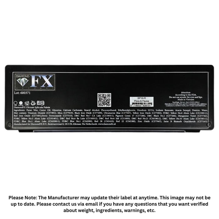 Diamond FX FLORA AND FAUNA Ultimate Splitcake Palette Ingredients: Paraffin Wax, Castor Oil, Glycerin, Calcium Carbonate, Stearyl Alcohol, Phenoxyethanol, Ethylhexylglycerin, Disodium EDTA, Sodium Benzoate, Acacia Senegal, Dextrin, Water, May contain: Titanium Dioxide (C177891), Mica (C177019), Black Iron Oxide (C177499), Ultramarine Blue (C177007), Yellow Iron Oxide (CI77492), FD&C Yellow No.6 Alum Lake (CI15985:1). Red Iron Oxide (C177491),Ferric Ferrocyanide (C177510), D&C Red No.7 CA Lake (CI 15850:1), Pigment Green 17 (C177288), D&C Black No.2 (C177266), Manganese Violet (C177742), FD&C Yellow No.5 Alum Lake (C119140:1), D&C Red No.6 Ba Lake (C115850:2). D&C Red No.6 Salt (C115850), D&C Red No.21 (C145380:2), D&C Yellow No.10 Alum Lake (C147005:1), FD&C Blue No.1 Alum Lake (C142090:1), FD&C Blue No.1 (C142090), Red 28 (C145410), Red 22 (C145380), Zinc Oxide (CI77947), Satin B Bismuth Oxychloride (C177163).