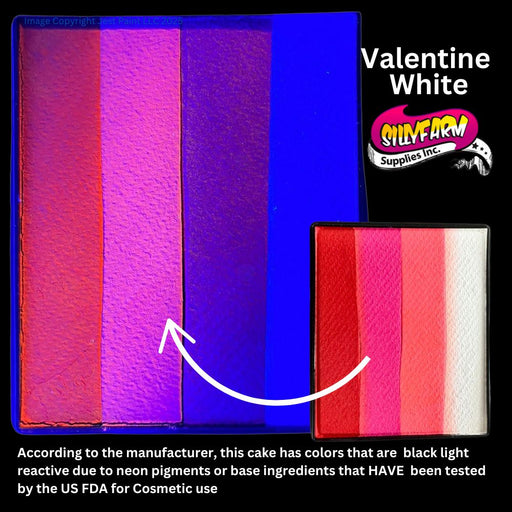 NOTICE: at our store we sell not only face and body paints and tools but also Special FX (SFX) products designed to be used for special effects only. UV/Neon colors that have that notice on their description and/or name indicate that they are not considered a cosmetic product within the USA and Europe. SOME neon/uv products used to make SILLY FARM RAINBOW CAKES AND ARTY CAKES have yet to bested by the USA FDA for cosmetic safety so manufacturers have labeled them and sell them as a Special FX product to be used on clothing, over prosthetics, etc to create a black light glow effect. This warning does not apply to all countries that we sell to, please look into your own country's regulations for neon face paints. Any Neon/UV paint without that warning has been determined to be cosmetic compliant by the manufacturer. At Jest Paint we don't label these products and are not responsible for manufacturer's claims or label's compliance, but we do our best to make sure that the label information provided to us is available on our website as well. If you have questions please contact the manufacturer directly.