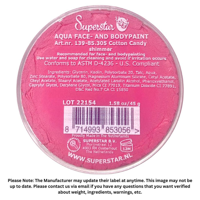 Superstar es una pintura facial muy cremosa con un pigmento brillante y una consistencia suave y aterciopelada. Se mezcla fácilmente, se seca en 30 segundos sobre la piel hasta obtener una cobertura pareja. Superstar Cotton Candy Shimmer es un rico y audaz rosa brillante. ¡Este color es perfecto para las máscaras y los diseños de rostro completo color rosa! ¡Este envase profesional de 45 gramos de Superstar Cotton Candy Shimmer tiene suficiente pintura para hacer que miles de niños y adultos sean super felices!