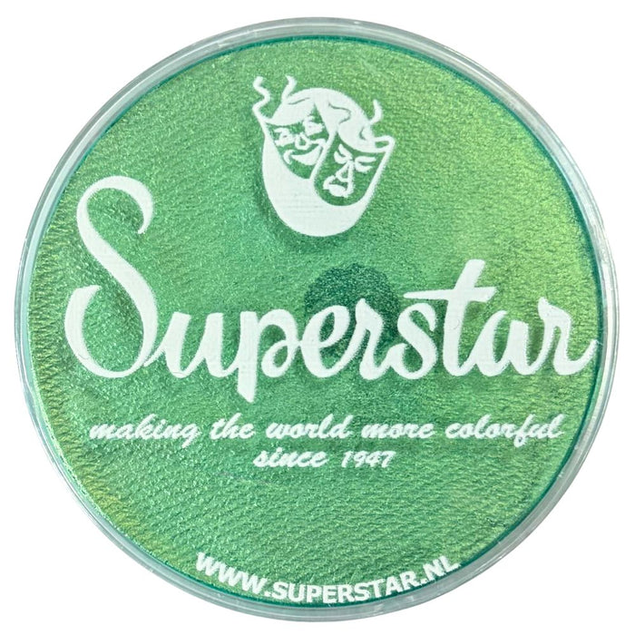 Superstar es una pintura facial muy cremosa con un pigmento brillante y una consistencia suave y aterciopelada. Se mezcla fácilmente, se seca en 30 segundos sobre la piel hasta obtener una cobertura pareja. Superstar Golden Green Shimmer es un verde suave y brillante con reflejos dorados. Debes cargar su esponja muy bien o aplicar una segunda capa para obtener una cobertura dorada realmente fuerte. ¡Perfecto para todas tus sirenas, hadas del bosque y hermosos pavos reales! ¡Superstar Golden Green Shimmer es perfecto para tus místicos diseños de pintacaritas! Este envase de 45 gr te permitirá pintar muchas caras.