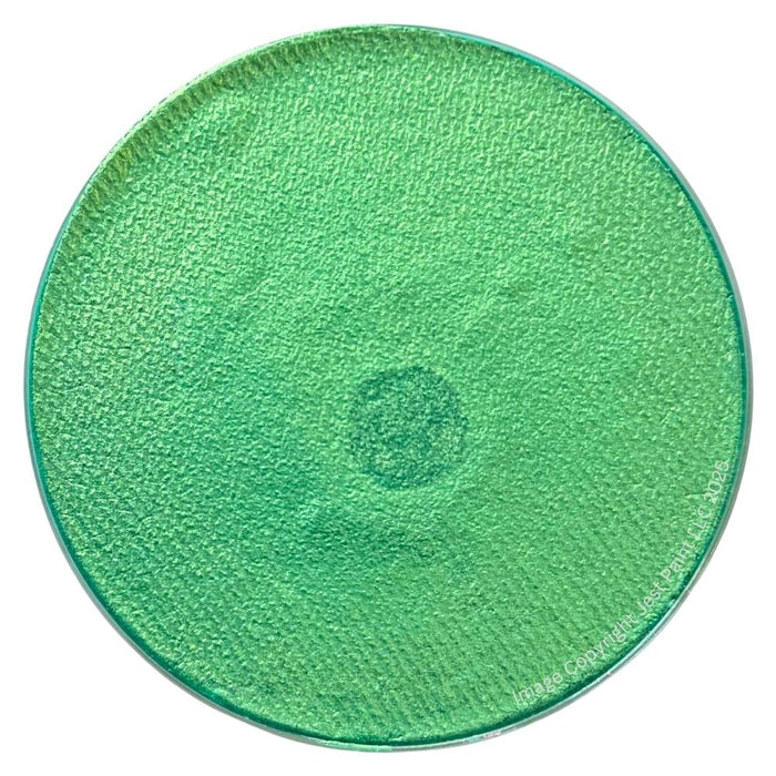 Superstar is a very creamy face paint with a shimmery pigment and smooth velvety consistency. They blend easily, dry within 30 seconds on the skin and dry to a smudge free coverage. Superstar Golden Green Shimmer is a soft shimmery Green with gold reflections. You should load your sponge really well, or apply a second coat to get a really strong silver coverage. Calling all mermaids, forest fairies and pretty peacocks! Superstar Golden Green Shimmer is perfect for your mystical magical face painting designs! This 45gr container will allow you to paint many faces.