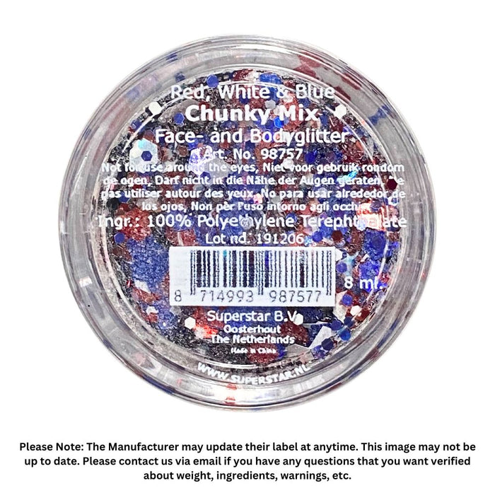Superstar Chunky Glitters were designed by the amazing Dutch Glitter Queen Sabine Gabrielle Vogel. The RED, WHITE AND BLUE glitter mix is perfect for applying on top of your face painting designs for extra bling on patriotic designs, flags, cats, dinos, flames, sports logos, dragons and more! Chunky Glitters are also great for teens and adults looking for festival make up looks. You can apply it on top of strands of hair coated in aloe or hair gel too!