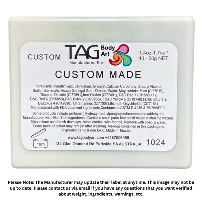 All regular colors are made with FDA compliant ingredients and are hypoallergenic. TAG cakes are made in Taiwan under the direction of TAG Body Art in Australia. They contain no parabens or lanolin to reduce the risk of allergic reactions. TAG cakes are vegan and they are not tested on animals.