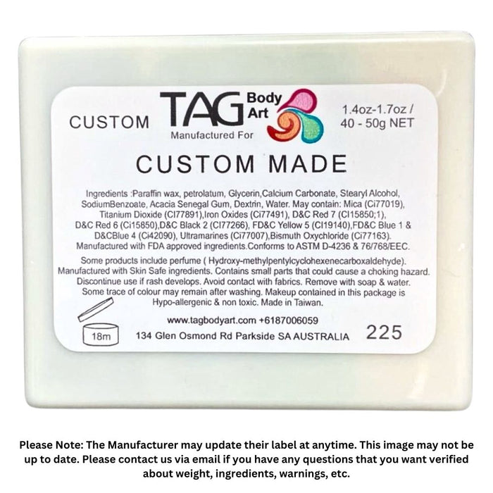 All regular colors are made with FDA compliant ingredients and are hypoallergenic. TAG cakes are made in Taiwan under the direction of TAG Body Art in Australia. They contain no parabens or lanolin to reduce the risk of allergic reactions. TAG cakes are vegan and they are not tested on animals.