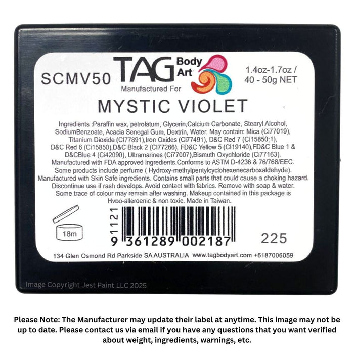 All regular colors are made with FDA compliant ingredients and are hypoallergenic. TAG cakes are made in Taiwan under the direction of TAG Body Art in Australia. They contain no parabens or lanolin to reduce the risk of allergic reactions. TAG cakes are vegan and they are not tested on animals.