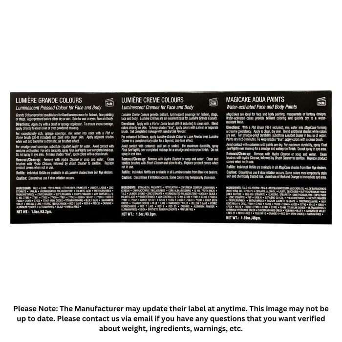 Ben Nye Lumiere Powders está lleno de brillo. Estos son hermosos colores para usar solos en la cara o para aplicar sobre la pintura facial para agregar color y brillo adicionales. Los colores incluidos en esta paleta son: Ice, Aztec Gold, Silver, Azalea, Cosmic Blue, Sun Yellow, Iced Gold, Tangerine, Chartreuse, Jade, Amethyst, y Cosmic Violet.