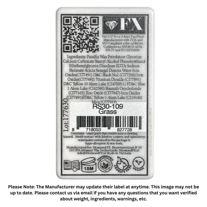 Diamond FX started as a small company in 2008 in Holland, Netherlands. All Essential and Metallic DFX colors are made with US FDA compliant cosmetic grade ingredients and are hypoallergenic. Diamond FX face paints contain no perfume, parabens or lanolin to reduce the risk of allergic reactions. Diamond FX cakes are vegan and they are not tested on animals. DFX cakes are made in Vietnam under the direction of the company in The Netherlands.