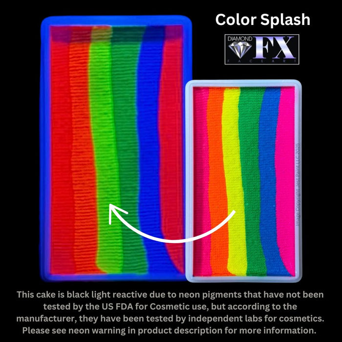 Color Splash is perfect for creating bold looking rainbows that will glow under black lights and create an awesome effect. Take it to your next rave or black light party and stand out! All Diamond FX small rainbow cakes are perfect to create fast and easy designs in just a few strokes of your brush! Your designs will look glow in the dark next to the black lights!