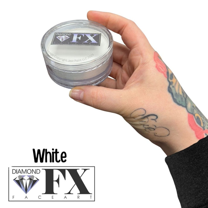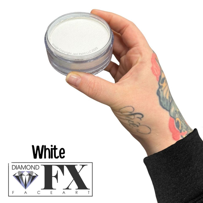 is designed to paint faces. You can use this white face paint on your next Halloween Costume, or to paint faces as a professional face painter or amateur painter at your next birthday party, fundraising, carnival, corporate event, or simply at home to have fun on your own or with your kids face painting fun designs. Diamond FX's Essential White is perfect for creating even bases and obtaining clean strokes when using a fine brush for your line work. Its very pigmented, making it look vivid even when dry. This color works great for sugar skulls, full face clowns, animal muzzles and whiskers, clouds, and more! Purchase the 90gr size when you know you'll be using a lot!