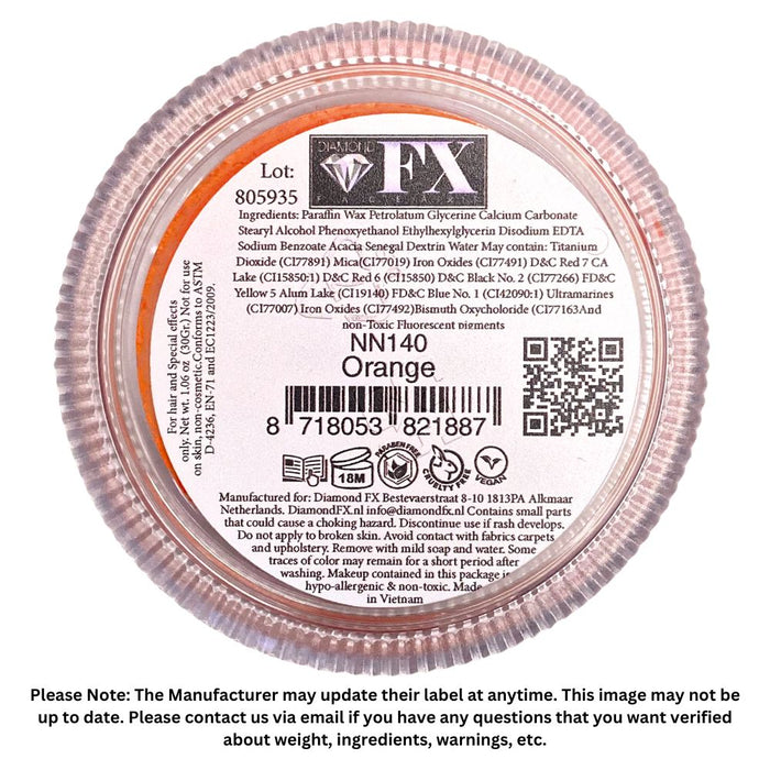 All neon colors are hypoallergenic. They contain no perfume, parabens or lanolin to reduce the risk of allergic reactions. Diamond FX cakes are vegan and they are not tested on animals. Diamond FX cakes are made in Vietnam under the direction of Diamond FX (a Netherlands company). Please keep in mind that this Special Effects neon paint has neon pigments that have yet to be tested by the USA FDA to be classified as a cosmetic product. Since the FDA has not yet tested these pigments, in the USA and Europe these products need to be labeled as special effects products not intended to be used on the skin. They can be used on hair, clothes, prosthetics, paper, etc. These neon cakes are considered face paint in other countries like Australia. According to the manufacturer, the pigments have been tested by independent laboratories and are considered safe for cosmetic application.
