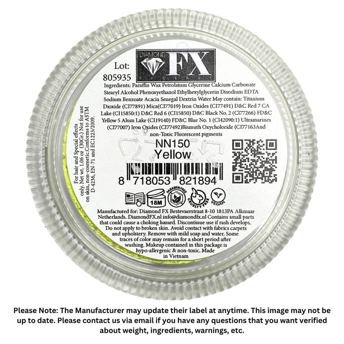 Diamond FX Neon Face Paint Ingredients - Paraffin Wax, Petrolatum, Glycerin, Calcium Carbonate, Stearyl Alcohol, phenoxyethanol (Preservative), ethylhexylglycerin, Disodium EDTA, Sodium Benzoate (preservative), Acacia Senegal, Dextrin, Water, Titanium Dioxide (CI77891) Benzoguanamine Formaldehyde Polymer, Basic Red 1, Basic Violet 11:1, Sovent Yellow 172, Phthalocyanine (Green7), Phthalocyanine Blue.
