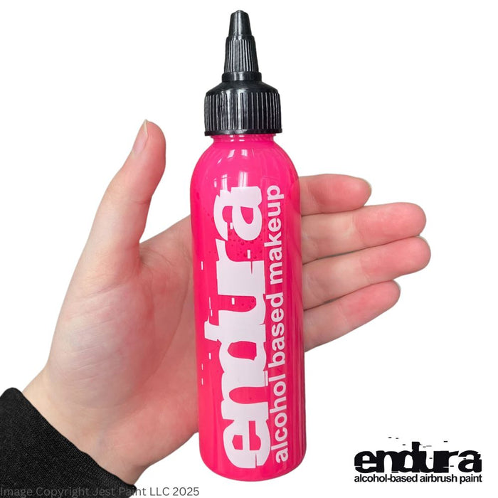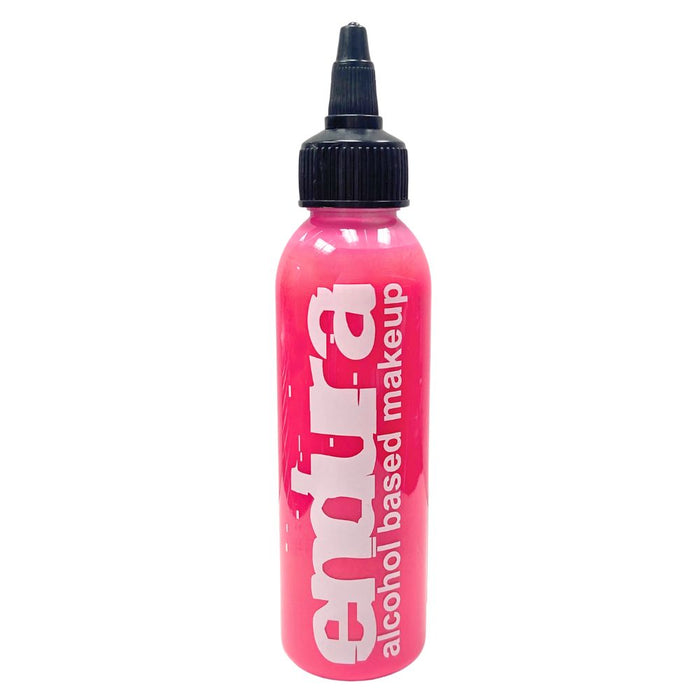 Endura Fluorescent Magenta is a bright glowy pink under black lights! It is a pretty pink under regular light, but doesn't have a strong dayglo effect. Get the 4oz bottle if you plan on doing a lot of black light face or body painting.Endura alcohol based airbrush body paint is a liquid makeup specially designed to be used under extreme conditions. Endura liquid body paints are alcohol based, making them water and sweat resistant, which means they are perfect for long lasting temporary tattoos, pool parties or body paintings that need to last for an entire day or even several days. Depending on care as well as skin type, the elements and situations Endura body paint is exposed to, it can last 1 to 7 days on your skin. Given how long it can last and that it requires some special care for removal, we recommend using Endura body paints only to paint body parts, keeping it away from the face. Thanks to its high pigmentation and thickness, Endura body paints can be used both with an airbrush or with a regular body painting sponge and brush.