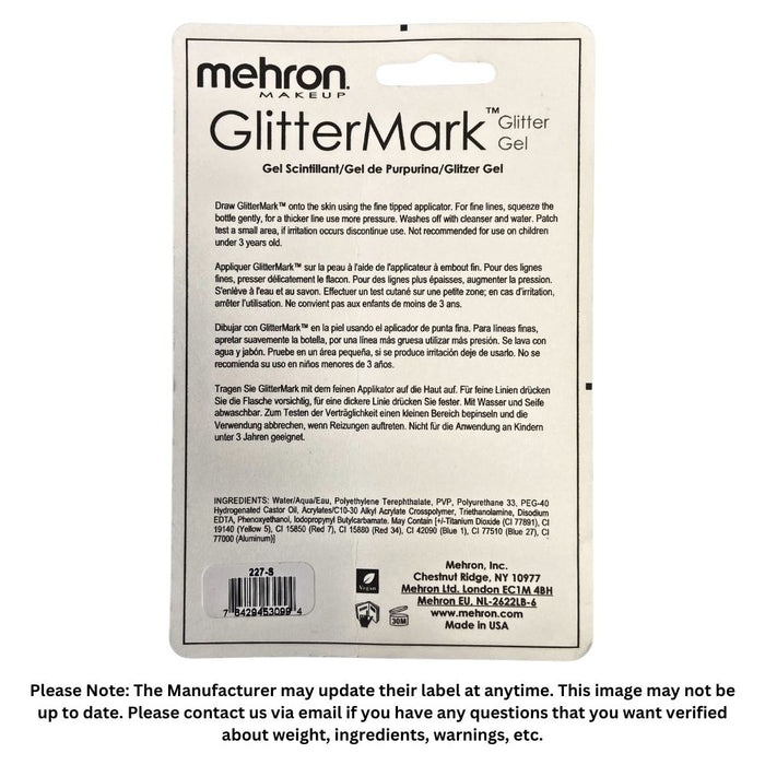 GlitterMark Ingredients: Water/Aqua/Eau, Polyethylene Terephthalate, PVP, Polyurethane 33, Carbomer, PEG-40 Hydrogenated Castor Oil, Sodium Hydroxide, Citric Acid, Diazolindinyl Urea, Methylparaben, Propylparaben, Disodium EDTA. May Contain [+/-Titanium Dioxide (CI 77891), CI 19140 (Yellow 5), CI 15850 (Red 7), CI 15880 (Red 34), CI 42090 (Blue 1), CI 77510 (Blue 27), CI 77000 (Aluminum)]. Ingredients are subject to change. For the most complete and up-to-date list of ingredients, refer to the product packaging. VEGAN. Use within 24 Months after opening. Made in USA