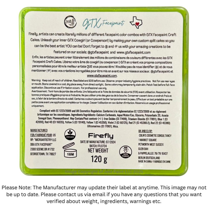All GTX REGULAR and METALLIC colors are FDA compliant. GTX Neon Colors, like most other brands, are for Special FX only due to the neon pigments in them that have not been tested and approved by the FDA for use in cosmetics. Made in China Manufactured for US RP: "Microartistry LLC DBA GTX Facepaint 2300 Scenic Dr #1732 Georgetown, TX 78627