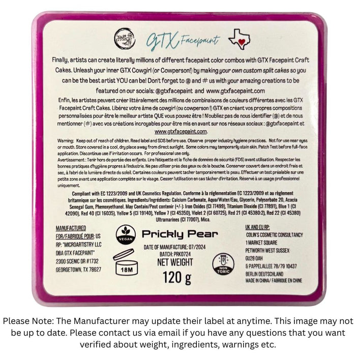All GTX REGULAR and METALLIC colors are FDA compliant. GTX Neon Colors, like most other brands, are for Special FX only due to the neon pigments in them that have not been tested and approved by the FDA for use in cosmetics. Made in China Manufactured for US RP: "Microartistry LLC DBA GTX Facepaint 2300 Scenic Dr #1732 Georgetown, TX 78627