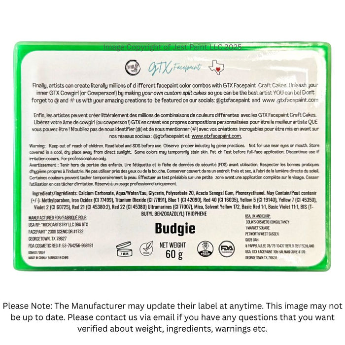 *The information provided below comes straight from the manufacturer, GTX Face Paints. Jest Paint LLC, its affiliates, associates and subsidiaries are not responsible or liable in any way for their claims or the results of following or not the manufacturer's instructions and or claims. This includes but is not limited to claims about the paint consistency, any liability insurance the manufacturer claims to hold, etc.IMPORTANT GTX Face Paint Manufacturer Usage Instructions about Crafting Cakes - Read Before Purchase
