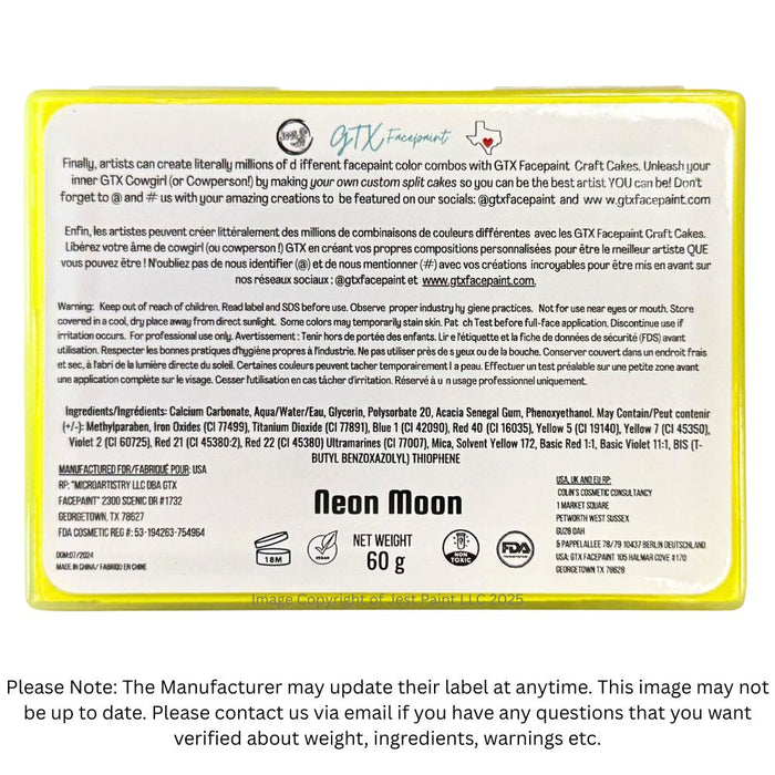 (The information below comes straight from GTX Facepaint. Jest Paint is not responsible for their statements. As mentioned above,  GTX's line of Neon colors are made with pigments that have NOT been approved by the FDA to be used in cosmetics (the FDA has not tested them yet for cosmetic use).  Following FDA guidelines, they are labeled as a Special FX product. Not For Cosmetic Use. Jest Paint ships worldwide, please check with your countries regulations to see if all ingredients have been tested and approved for cosmetic use.)