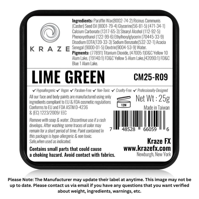 Kraze Lime Green Face Paint is FDA compliant for cosmetic use. It is a non toxic, high grade hypoallergenic face paint line that was developed with the input of face painters from around the world. Kraze is Vegan and it is gluten, perfume, and paraben free. Kraze does not contain nut based ingredients either, which makes it a great choice for those with nut allergies. Kraze Face Paint is wax based and it is easy to use, even if it is your first time face painting. When applied as instructed, Kraze has a crack resistant long lasting finish. Check out the whole line of Kraze face paints today! The consistency, weight and volume may vary depending on water evaporation after production