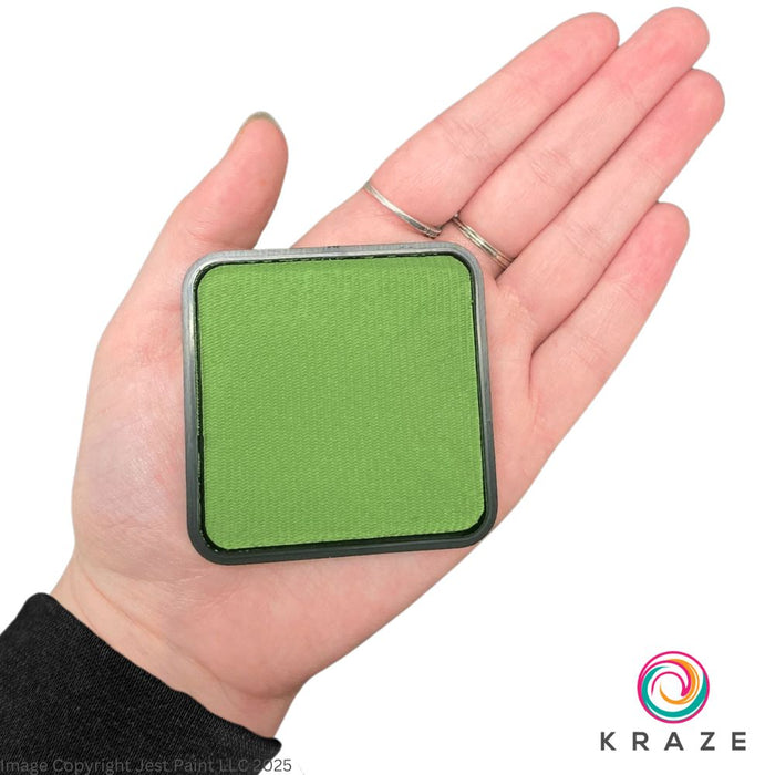 Kraze FX face paint is excellent for new and professional face painters and makeup artists. The wax base for Kraze FX Lime Green face paint makes it easy to use and remains comfortable and flexible on the skin but also smudge free. Looking for a perfect lime green face paint for full face turtles, witches, snakes, dragon face painting designs? Kraze FX Lime Green face paint is great for line work and opaque bases. Blend with white, yellow, dark green or blues to make gradients for you full face critters.
