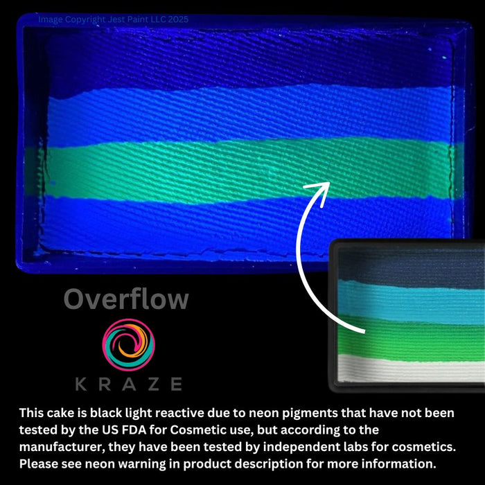 The Overflow cake is a beautiful combo for butterflies, flowers, and hearts. Kraze FX domed split cakes come in two sizes. This 1 stroke style split cake is long and skinny and perfect for loading up with a 1" or 3/4" flat or angle brush. The domed shape helps you get a better load because the surface area is longer that a traditional flat 1 stroke, and the water runs off to the edges so that you can drain it off if needed and avoid a muddy center. The raised dome helps slow down the ditch that usually appears in the middle of a 1 stroke cake as well. The wax base for Kraze FX paint makes it easy to use and remains comfortable and flexible, but also smudge free. This cake contains some neon colors. Kraze FX's Neon colors contain non-toxic pigments that have not been tested by the FDA for use in cosmetics, but they have been independently tested to show that they are hypoallergenic and safe for cosmetic use. Due to the fact that the FDA does Not recognize them as containing only cosmetic grade pigments, they are labeled as a Special FX product for use on Hair and Special Effects Only.