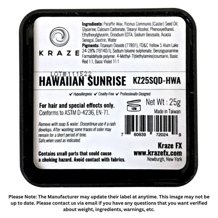 The Hawaiian Sunrise rainbow split cake is a beautiful bold and mega bright combo perfect for creating outstanding sunset scenes that will glow under regular light; the neon pink, neon orange and neon purple will also glow under a black light. Kraze domed rainbow cakes cakes come in two sizes. This Rainbow Cake style split cake is square and perfect for loading up with a half circle sponge. The domed shape helps you get a better load because the surface area is longer that a traditional flat rainbow cake, and the water runs off to the edges so that you can drain it off if needed and avoid a muddy center. The raised dome helps slow down the ditch that usually appears in the middle of a split cakes as well. The wax base formula for Kraze FX paint makes it easy to use and remains comfortable and flexible, but also virtually smudge free.