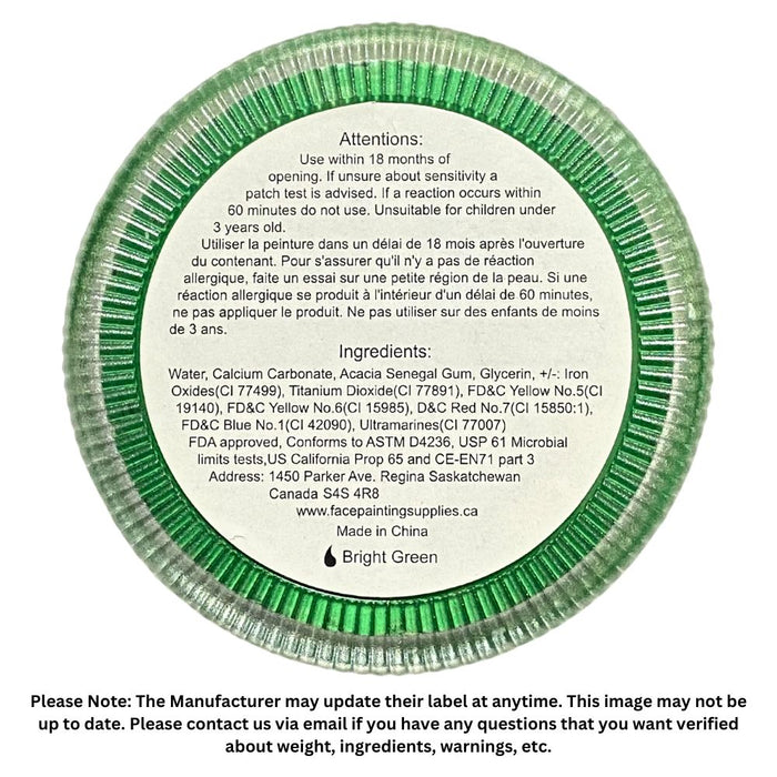 Use a wet painting brush. Store in clean and dry location with the lid on. Colors can be mixed. Cover the cake with the lid after use (once all added water has dried out). Remove from the skin with soap and water. Use within 18 months of opening. If unsure about sensitivity a patch test is advised. If a reaction occurs within 60 minutes do not use. Unsuitable for children under 3 years old due to small parts that may cause choking. May stain fabrics.
