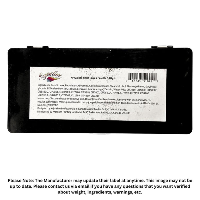 This product includes a palette of 10 Essential 10gr Rainbow cakes using Kryvaline colors, and a solid black and white 10gr cake. This is a good palette to test out the Kryvaline colors. The pots may be hard to use with sponges because of their size, though it is doable with small sponges.