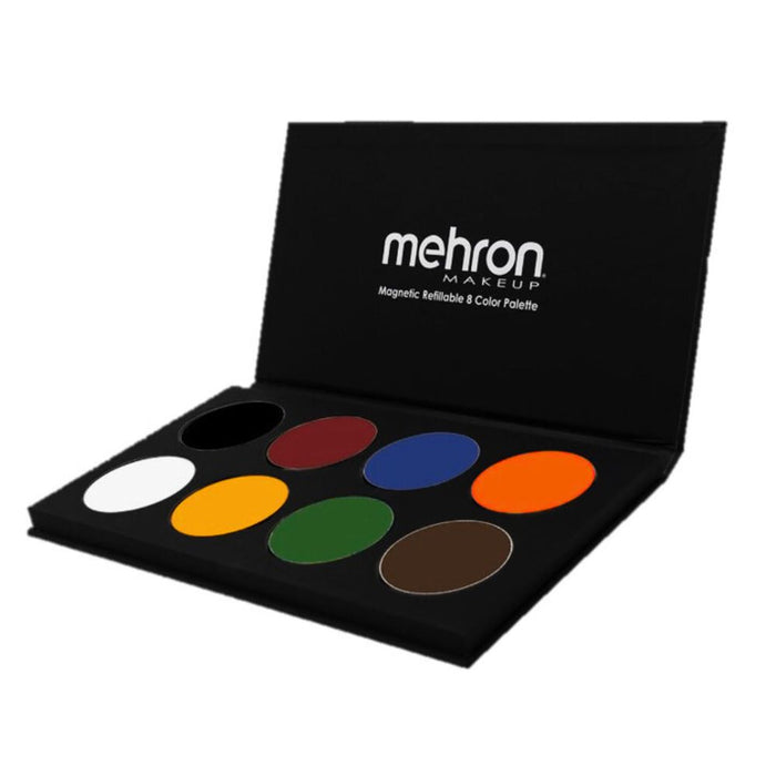 This Mehron Paradise palette contains eight 7gr water-based face paint colors in Mehron's Basic color line. The new palette is magnetic so that you can mix and match colors from other palettes or refill them when you run out of a color. The palette opens flat.