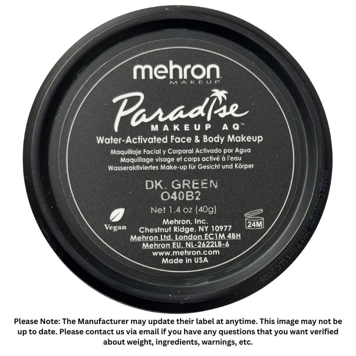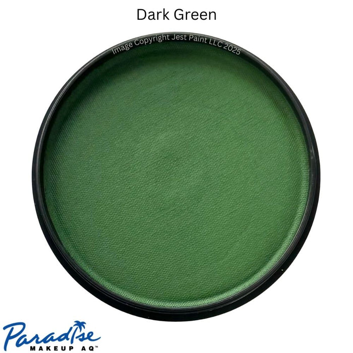 Mehron Paradise Face Paint es ideal para crear bases y combinar colores. Paradise Dark Green es un verde bosque intermedio oscuro. ¡Ideal para hojas, monstruos y diseños de lagarto en caras!