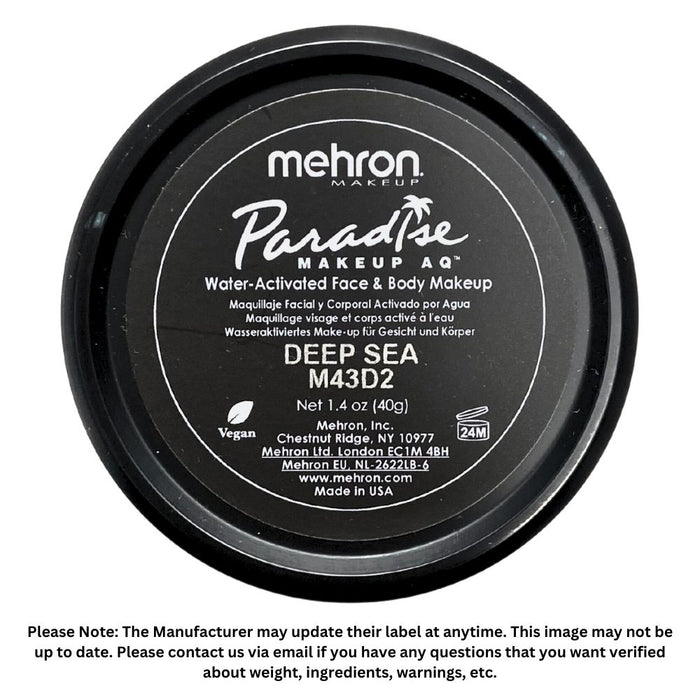 Mehron Paradise Face Paint es ideal para crear bases y combinar colores. Paradise Nuance Deep Sea es un verde azulado oscuro y es muy pigmentado. Este verde azulado es ideal para diseños femeninos y criaturas marinas.