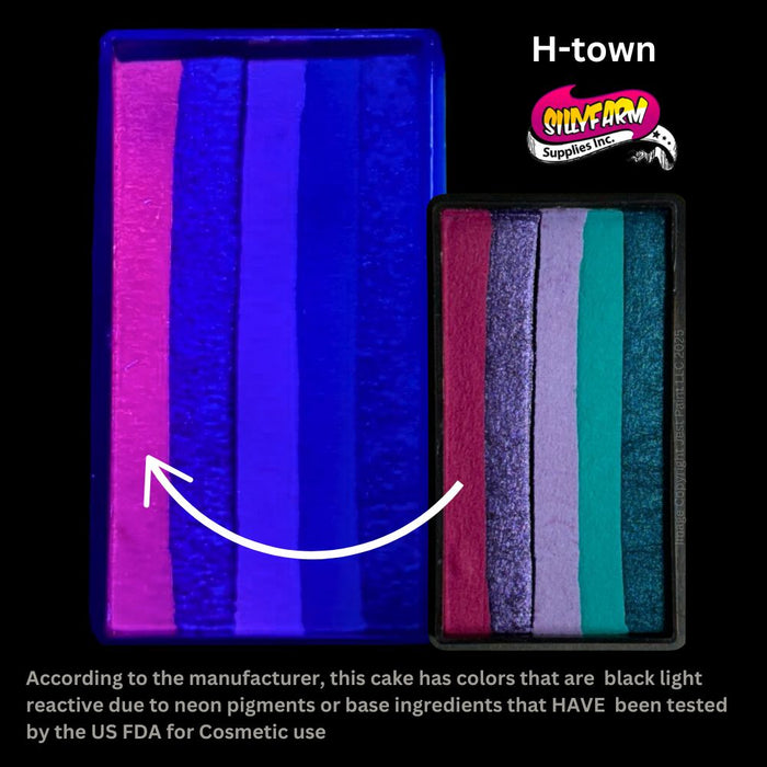 Arty Brush Cakes are small face painting rainbow cakes that combine a few different colors that blend well together. Arty Brush Cakes make it possible to create beautiful designs with a quick stroke of a brush or swipe of a sponge! H Town is part of the Paty de Leon Collection. This beautiful cake is named after her home town of Houston. This bold combo of blues, teals, purples and berry wine is perfect for painting flowers, butterflies, birds, crowns, fairy wings and so much more! H Town has a lot of shimmer and punch and will stand out on any skin tone.