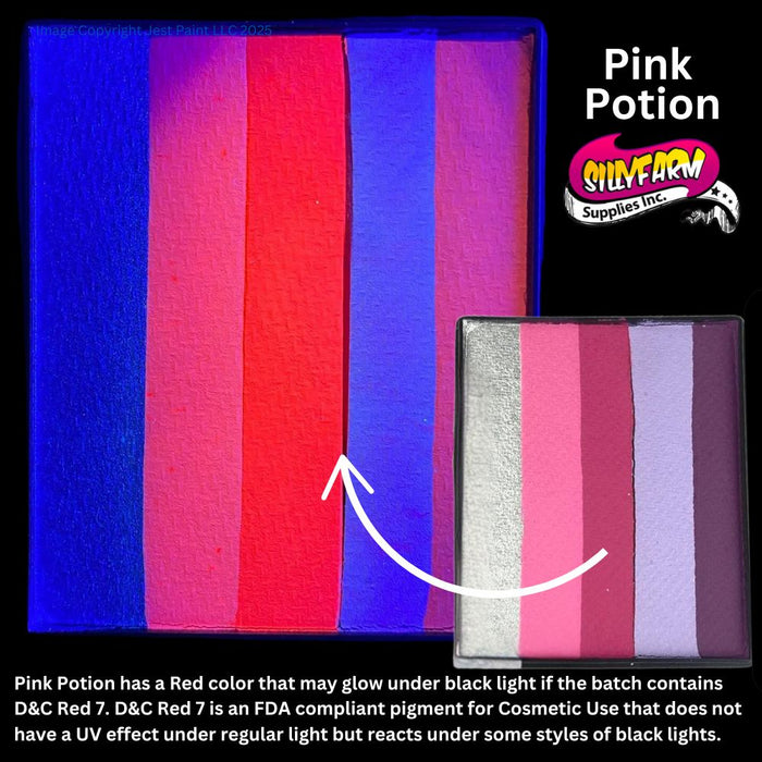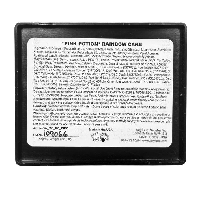 Silly Farm Rainbow Cakes contain multiple colors in one container, this allow you to lay several colors down at once with the swipe of your sponge! Rainbow Cakes make it easy to create beautiful bases for designs with colors that blend well! Pink Potion is great for princess masks!