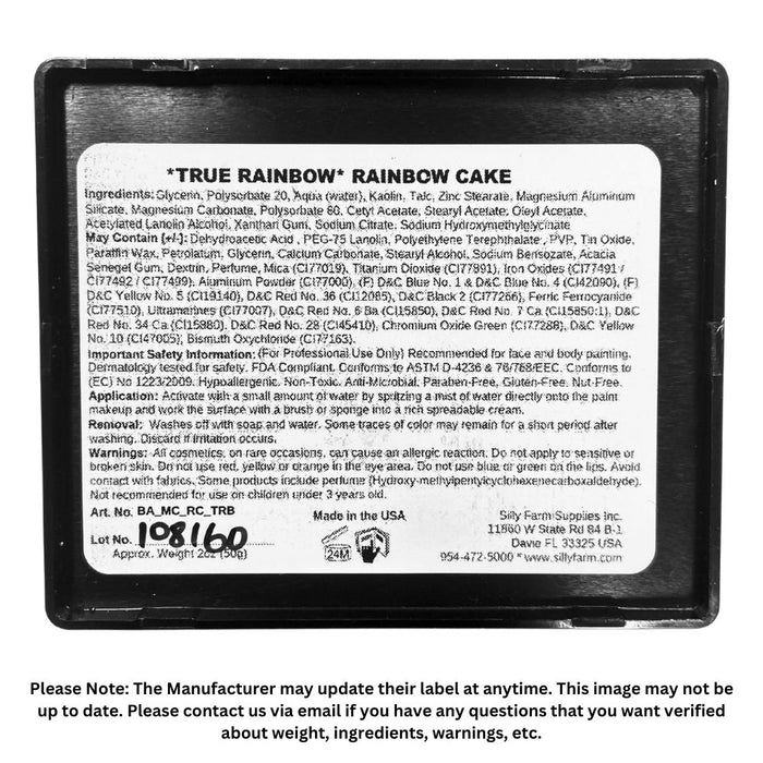 Silly Farm Rainbow Cakes contain multiple colors in one container, this allow you to lay several colors down at once with the swipe of your sponge! Rainbow Cakes make it easy to create beautiful bases for designs with colors that blend well! True Rainbow is a must have in your face painting kit!