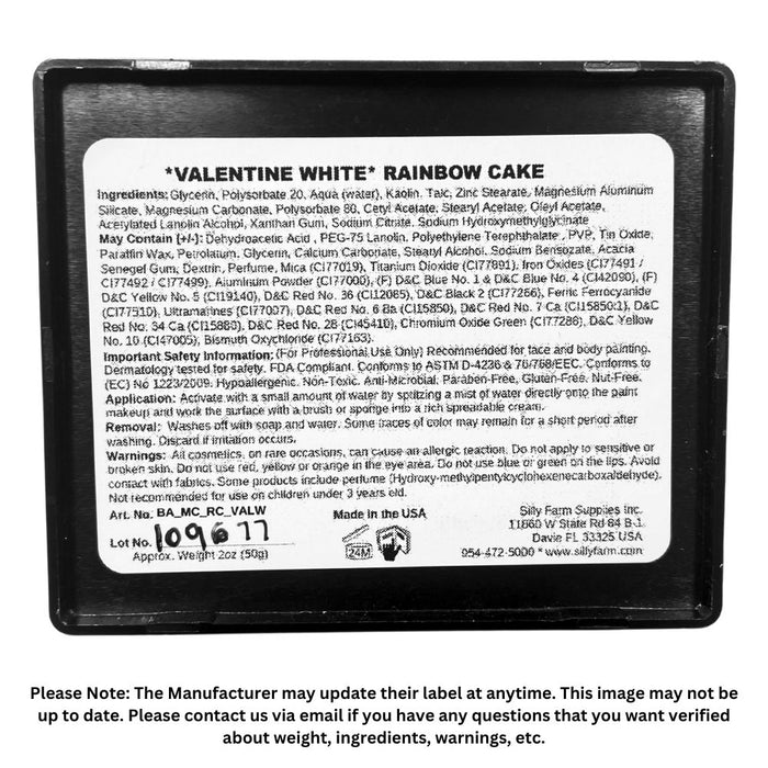 Please fully read before using this product. Important Safety Information (For Professional Use Only) Dermatology tested for safety but does not meet with International Cosmetic regulations. FDA Compliant. Non-Toxic and Anti-Microbial. Gluten-Free and Nut-Free. Application: Activate with a small amount of water by spritzing a mist of water directly onto the paint makeup and work the surface with a brush or sponge into a rich spreadable cream. Removal: Washes off with soap and water. Some traces of color may remain for a short period after initial washing. Please note: Silly Farm dedicated time and excellence to adapt our Rainbow Cakes containing neon colors to the new FDA regulations for neon pigments. Please be aware the new color combinations slightly vary from the cakes you're accustom too. However, the same quality and vibrant colors you and your clients love has not changed. The colors are vibrant however, the reactivity for black light is minimal.