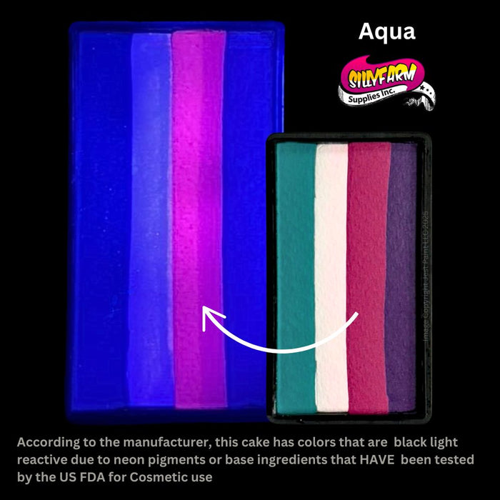 The Silly Farm Aqua Arty Brush cake contains Deep Ocean, White, Neon Pink, and Neon Purple. The FDA compliant neon colors have a minimal glow under black light.