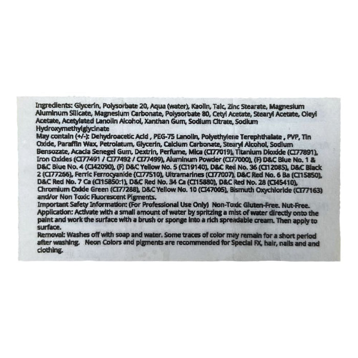 Please fully read before using this product. Important Safety Information (For Professional Use Only) Dermatology tested for safety but does not meet with International Cosmetic regulations. FDA Compliant. Non-Toxic and Anti-Microbial. Gluten-Free and Nut-Free. Application: Activate with a small amount of water by spritzing a mist of water directly onto the paint makeup and work the surface with a brush or sponge into a rich spreadable cream. Removal: Washes off with soap and water. Some traces of color may remain for a short period after initial washing. Warnings: All cosmetics, on rare occasions, can cause an allergic reaction to sensitive or broken skin. Do not use red on the lips. Do not apply yellow or orange in the eye area. Do not use blue or green on the lips. Not recommended for use on children under 3 years old. Please note: Silly Farm dedicated time and excellence to adapt our Rainbow Cakes containing neon colors to the new FDA regulations for neon pigments. Please be aware the new color combinations slightly vary from the cakes you're accustom too. However, the same quality and vibrant colors you and your clients love has not changed. The colors are vibrant however, the reactivity for black light is minimal.