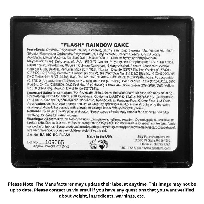 Ingredients: Silly Farm Rainbow cakes are made from multiple brands of paint. Check the ingredients on FAB, TAG, and Kryolan to get an idea of what ingredients are in this cake.